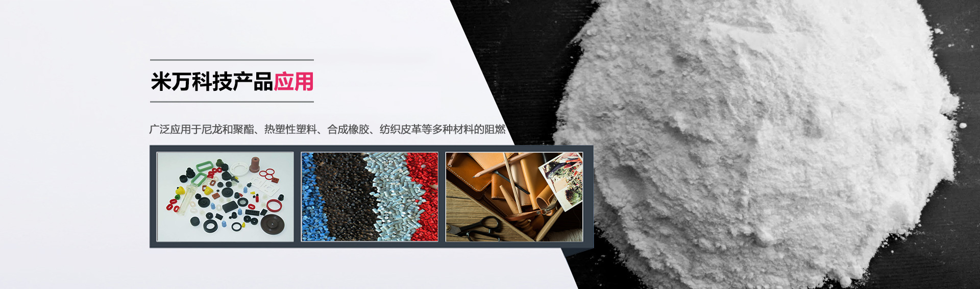 米萬科技在橡膠行業(yè)有一系列研發(fā)的阻燃劑產品。產品不含鹵素,由于表面經(jīng)過改