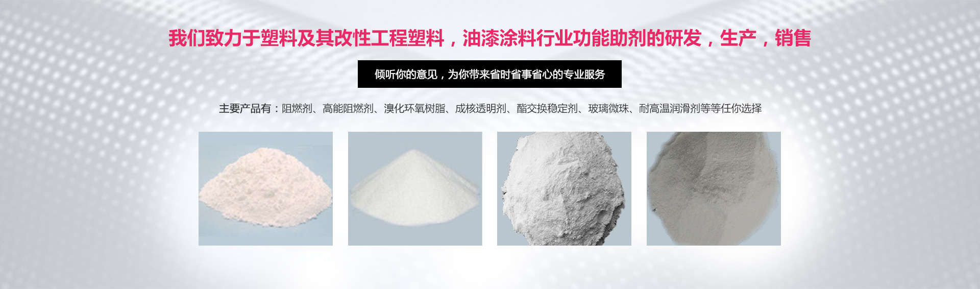 公司全心致力于以下幾個領域:阻燃劑在工程改性塑料的運用,鹵素及其無鹵